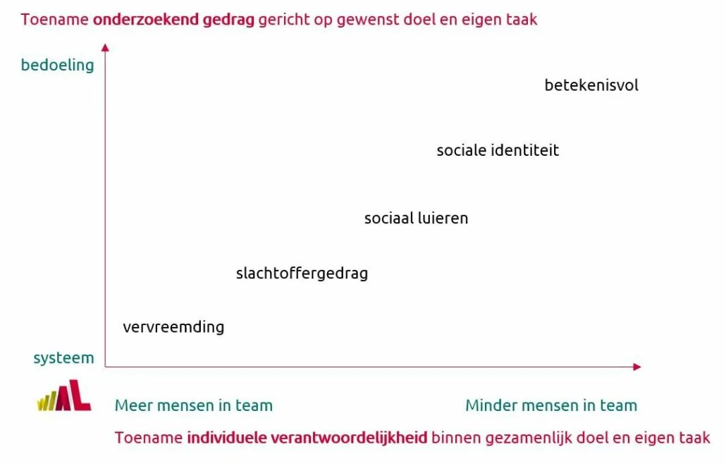 Uit verschillende onderzoeken blijkt dat naarmate het aantal mensen in een team groeit, mensen zich steeds minder verantwoordelijk voelen voor hun persoonlijke bijdrage aan het behalen van het groepsdoel en daarmee het bestaansrecht van het team. Met als gevolg je hebt veelal meer mensen nodig om dezelfde hoeveelheid werk te kunnen doen! De invloed die je als teamleider en afdelingsmanager hebt, is goed te kijken wat bij jou de optimale groepsgrootte is om een bepaald deel van het werk te realiseren en bedenk daarbij dat het bij te veel mensen in een team leidt tot een lagere bijdrage per persoon en minder zelfwaardering en genoegdoening per individueel teamlid (zie de x-as in de afbeelding).